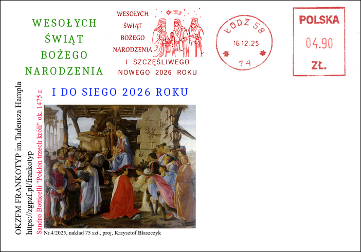 Aby tradycji Bożonarodzeniowej stało się zadość, również i w tym roku Ogólnopolski Klub Zbieraczy Frankatur Mechanicznych "FRANKOTYP" im. Tadeusza Hampla stosował będzie okolicznościową nakładkę na maszynę frankującą. Zamiast kupować na poczcie znaczki, każdy z Was może swoją korespondencję z życzeniami świątecznymi udekorować przygotowaną na tę okoliczność frankaturą pokazującą Trzech Króli w drodze do Betlejem na nakładce okolicznościowej. Do tego przewidziana jest koperta okolicznościowa przedstawiająca obraz Sandro Botticelliego z ok. 1477 r. "Pokłon trzech króli". Wszystko co trzeba zrobić, to przygotować kartki z życzeniami lub zaadresowane koperty C6 z kartkami z życzeniami do Waszych bliskich w środku i nadesłać je na adres naszego klubu. Nadesłane kartki wkładane będą do koperty okolicznościowej i po ostemplowaniu ich frankaturą okolicznościową roześlemy je do Waszych bliskich na terenie całego kraju. Nadesłane gotowe koperty z życzeniami również po ostemplowaniu frankaturą zostaną rozesłane zgodnie z adresami do Waszych bliskich. Żeby uniknąć nachodzenia rysunku na kopercie na frankaturę, tak by frankatura była wyraźna, czytelna i wyglądała estetycznie, należy pozostawić niezadrukowany obszar długości 11 cm i wysokości 4 cm mierząc od prawego górnego narożnika. Każdy kto chce wysłać bliskim lub otrzymać świąteczną frankaturę może może zamówić ją na zwykłej białej kopercie w cenie 6 zł/szt, lub na kopercie okolicznościowej w cenie 8 zł/szt. Odbitki frankatury listem poleconym będą wykonywane tylko na białych kopertach w cenie 9,50 zł/szt. (brak miejsca na kopercie okolicznościowej na e-R-kę). Jest możliwość odesłania frankatur w liście zwrotnym, tak by nie narazić koperty z frankaturą na uszkodzenie w transporcie, wówczas proszę doliczyć do zamówienia 9,50 zł na zwrotny list polecony i kopertę. Porto frankatur zgodne z cennikiem poczty tylko w obrocie krajowym. Zamówienia które mają być wysłane na zagraniczne adresy tylko w kopertach zwrotnych, zgodnie z cennikiem Poczty Polskiej (list priorytetowy nierejestrowany 10 zł, list polecony priorytetowy 22 zł). Zrealizowane zostaną wszystkie zamówienia nadesłane do 12.12.2025 r., korespondencję do ofrankowania proszę kierować na adres: