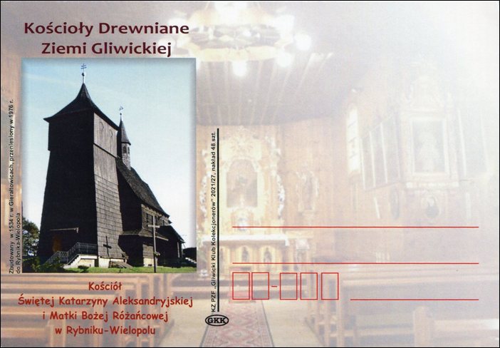 Kościół Świętej Katarzyny Aleksandryjskiej i Matki Bożej Różańcowej w Rybniku-Wielopolu na kartce okolicznościowej wydanej przez Gliwicki Klub Kolekcjonera. Św. Katarzyna Aleksandryjska - patronka kolejarzy w Polsce.