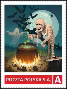 Październik 2025 Zamawiający: Poczta Polska S.A. Nakład: 1050 sztuk [350 arkuszy 3+3+3] numery arkuszy: brak danych) Projekt: Agnieszka Sancewicz Źródło informacji: sklep.poczta-polska.pl Uwagi: nadruk na arkuszu: 2025 / HALLOWEEN - góra, nad lewym znaczkiem |
