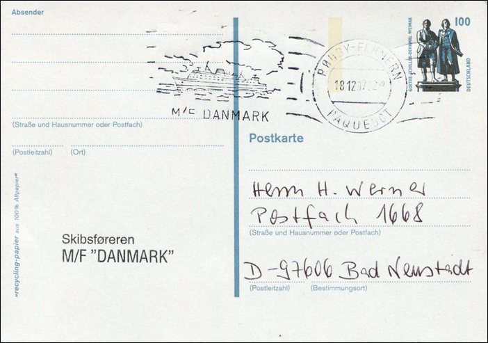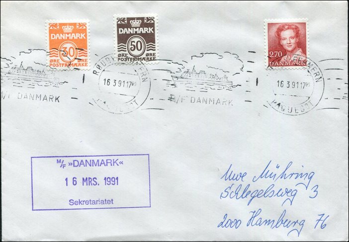 Danmark – duński prom kolejowy. Zbudowany w 1968 r. przez stocznię Helsingör Skibsværft & Maskinbyggeri A/S, Helsingör, Dania na zamówienie Danske Statsbaner (DSB). Od 7 czerwca 1968 do 18 grudnia 1997 r. w eksploatacji na Vogelfluglinie (Rødby – Puttgarden). Zezłomowany w 2000 r. Długość: 144,50 m. Szerokość 17,70 m. Zanurzenie 6,00 m. Pokład kolejowy trzytorowy o długości 341,97 m - pojemność pokładu wynosiła 30 wagonów towarowych.