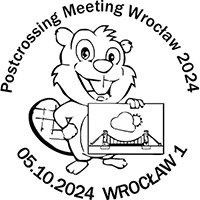 Datownik okolicznościowy Postcrossing Meeting Wrocław 2024. Na datowniku most Grunwaldzki we Wrocławiu - na moście trakcja tramwajowa.
