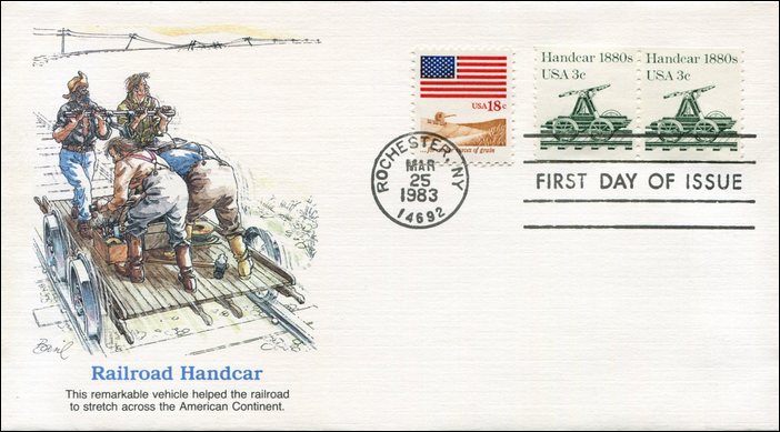 Drezyna ręczna na znaczku i kopercie FDC USA z marca 1983 r.