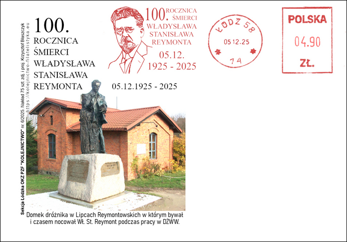 Ogólnopolski Klub Zbieraczy Frankatur Mechanicznych "FRANKOTYP" im. Tadeusza Hampla będzie stosował nakładkę okolicznościową na maszynę frankująca z okazji 100. rocznicy śmierci Władysława Stanisława Reymonta. Przewidziane są koperty okolicznościowe na których pokazano fotografię domku dróżnika, w którym bywał i czasem nocował Władysław Stanisław Reymont kiedy był pracownikiem Drogi Żelaznej Warszawsko-Wiedeńskiej. Odbitki listem zwykłym wykonywane będą na kopertach zwykłych białych lub okolicznościowych. Każdy kto chce otrzymać frankaturę może może zamówić ją na zwykłej białej kopercie w cenie 6 zł/szt, lub na kopercie okolicznościowej w cenie 8 zł/szt. Odbitki frankatury listem poleconym będą wykonywane tylko na białych kopertach w cenie 9,50 zł/szt. (brak miejsca na kopercie okolicznościowej na e-R-kę). Można również nadesłać zaadresowane koperty formatu C6 do ofrankowania okolicznościową nakładką. Jest możliwość odesłania frankatur w liście zwrotnym, tak by nie narazić koperty z frankaturą na uszkodzenie w transporcie, wówczas proszę doliczyć do zamówienia 9,50 zł na zwrotny list polecony i kopertę. Porto frankatur zgodne z cennikiem poczty tylko w obrocie krajowym. Zamówienia które mają być wysłane na zagraniczne adresy realizowane będą tylko w kopertach zwrotnych, przesyłki zgodnie z cennikiem Poczty Polskiej (list priorytetowy nierejestrowany 15 zł, list polecony priorytetowy 24 zł). W przypadku wątpliwości proszę pytać o koszt realizacji zamówienia. Zrealizowane zostaną wszystkie zamówienia nadesłane do 02.12.2025 r., korespondencję do ofrankowania proszę kierować na adres: