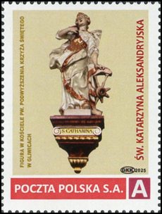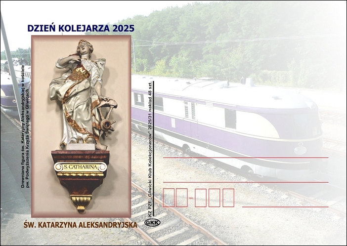 Kościół Świętej Katarzyny Aleksandryjskiej i Matki Bożej Różańcowej w Rybniku-Wielopolu na kartce okolicznościowej wydanej przez Gliwicki Klub Kolekcjonera. Św. Katarzyna Aleksandryjska - patronka kolejarzy w Polsce.