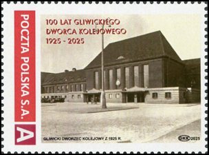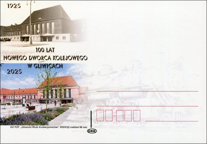 "MójZNACZEK" i kartka okolicznościowa wydane przez Gliwicki Klub Kolekcjonera z okazji 100-lecia gliwickiego dworca kolejowego.