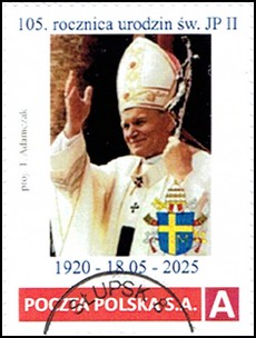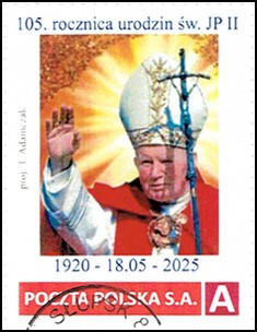 Maj 2025 105. rocznica urodzin św. JP II 1920 - 18.05 - 2025 proj. T. Adamczak Zamawiający: brak danych Nakład: brak danych [arkusz] (numery arkuszy: brak danych) Projekt: T. Adamczak |