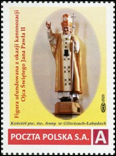 Sierpień 2025 Figura ufundowana z okazji kanonizacji Ojca Świętego Jana Pawła II Kościół pw. św. Anny w Gliwicach-Łabędach Zamawiający: Gliwicki Klub Kolekcjonerów Nakład: 153 sztuki [17 arkuszu 9] (numery arkuszy: m.in. 204905-204920) Projekt: Władysław Gębczyk Źródło informacji: Biuletyn Filatelistyczny 36/2025, s. 4 Uwagi: nadruk na arkuszu: ZIEMIA GLIWICKA ŚW. JANOWI PAWŁOWI II / Figura św. Jana Pawła II - góra, Gliwicki Klub Kolekcjonerów - dół |
