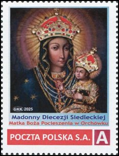 Sierpień 2025 Madonny Diecezji Siedleckiej Matka Boża Pocieszenia w Orchówku Zamawiający: Gliwicki Klub Kolekcjonerów Nakład: 33 sztuki [33 arkusze 1+1+1+1+1+1+1+1+1] (numery arkuszy: m.in. 206315) Projekt: Władysław Gębczyk Źródło informacji: Biuletyn Filatelistyczny 36/2025, s. 4 Uwagi: nadruk na arkuszu: Madonny Diecezji Siedleckiej - góra, Gliwicki Klub Kolekcjonerów - dół |
