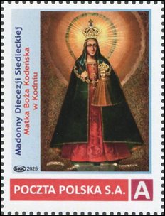 Sierpień 2025 Madonny Diecezji Siedleckiej Matka Boża Kodeńska w Kodniu Zamawiający: Gliwicki Klub Kolekcjonerów Nakład: 33 sztuki [33 arkusze 1+1+1+1+1+1+1+1+1] (numery arkuszy: m.in. 206315) Projekt: Władysław Gębczyk Źródło informacji: Biuletyn Filatelistyczny 36/2025, s. 4 Uwagi: nadruk na arkuszu: Madonny Diecezji Siedleckiej - góra, Gliwicki Klub Kolekcjonerów - dół |