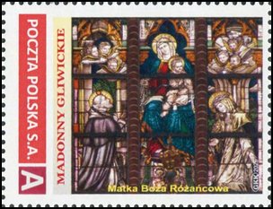 Sierpień 2025 Madonny Gliwickie Matka Boża Różańcowa Zamawiający: Gliwicki Klub Kolekcjonerów Nakład: 126 sztuk [14 arkuszy 9] (numery arkuszy: m.in. 206350-206355) Projekt: Władysław Gębczyk Źródło informacji: kzgkk.pl Uwagi: nadruk na arkuszu: Matka Boża Różańcowa - strona prawa, Gliwicki Klub Kolekcjonerów - strona lewa |