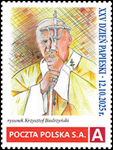 Wrzesień 2025 XXV Dzień Papieski - 12.10.2025 r. rysunek Krzysztof Biedrzyński Zamawiający: Wydawnictwo VANDRE Nakład: brak informacji [arkusz 9] (numery arkuszy: brak informacji) Projekt: brak informacji Źródło informacji: Biuletyn Filatelistyczny 37/2025, s. 4 Uwagi: nadruk na arkuszu: XXV DZIEŃ PAPIESKI / 12.10.2025 r. - góra i dół |