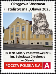 Wrzesień 2025 Okręgowa Wystawa Filatelistyczna "Oława 2025" 80-lecie Szkoły Podstawowej nr 1 im. Bolesława Chrobrego w Oławie Zamawiający: Zarząd Okręgu Wrocławskiego PZF Nakład: 147 sztuk [49 arkuszy 3+3+3] numery arkuszy: 207592-207599, 207748-207759, 208403-208418, 209698-209710) [dodruk] Projekt: Rafał Wincewicz, Jan Ciętak, Zdzisław Sacha Źródło informacji: Zarząd Okręgu Wrocławskiego PZF Uwagi: nadruk na arkuszu: Okręgowa Wystawa Filatelistyczna "Oława 2025" - góra, 1000-lecie koronacji Bolesława Chrobrego - pierwszego króla Polski - strona lewa, 80-lecie Szkoły Podstawowej nr 1 im. Bolesława Chrobrego w Olawie - strona prawa, 70-lecie koła PZF nr 37 w Oławie - dół |
