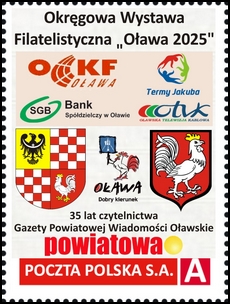 Wrzesień 2025 Okręgowa Wystawa Filatelistyczna "Oława 2025" 35 lat czytelnictwa Gazety Powiatowej Wiadomości Oławskie Zamawiający: Zarząd Okręgu Wrocławskiego PZF Nakład: 147 sztuk [49 arkuszy 3+3+3] numery arkuszy: 207592-207599, 207748-207759, 208403-208418, 209698-209710) [dodruk] Projekt: Rafał Wincewicz, Jan Ciętak, Zdzisław Sacha Źródło informacji: Zarząd Okręgu Wrocławskiego PZF Uwagi: nadruk na arkuszu: Okręgowa Wystawa Filatelistyczna "Oława 2025" - góra, 1000-lecie koronacji Bolesława Chrobrego - pierwszego króla Polski - strona lewa, 80-lecie Szkoły Podstawowej nr 1 im. Bolesława Chrobrego w Olawie - strona prawa, 70-lecie koła PZF nr 37 w Oławie - dół |