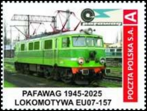 Wrzesień 2025 Pafawag 1945-2025 Lokomotywa EU07-157 Zamawiający: Klub Sympatyków Kolei we Wrocławiu Nakład: 120 sztuk [40 arkuszy 3+3+3] (numery arkuszy: brak informacji) [dodruk] Projekt: brak informacji Źródło informacji: Biuletyn Filatelistyczny 38/2025, s. 1 Uwagi: nadruk na arkuszu: 80-LECIE PAFAWAG (1945-2025) - góra, TABOR PRODUKCJI PAFAWAG WROCŁAW - dół |
