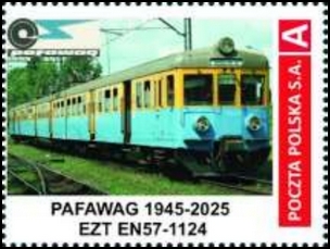 Wrzesień 2025 Pafawag 1945-2025 EZT EN57-1124 Zamawiający: Klub Sympatyków Kolei we Wrocławiu Nakład: 120 sztuk [40 arkuszy 3+3+3] (numery arkuszy: brak informacji) [dodruk] Projekt: brak informacji Źródło informacji: Biuletyn Filatelistyczny 38/2025, s. 1 Uwagi: nadruk na arkuszu: 80-LECIE PAFAWAG (1945-2025) - góra, TABOR PRODUKCJI PAFAWAG WROCŁAW - dół |