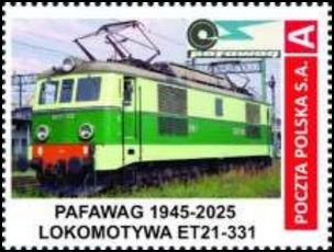 Wrzesień 2025 Pafawag 1945-2025 Lokomotywa ET21-331 Zamawiający: Klub Sympatyków Kolei we Wrocławiu Nakład: 120 sztuk [40 arkuszy 3+3+3] (numery arkuszy: brak informacji) [dodruk] Projekt: brak informacji Źródło informacji: Biuletyn Filatelistyczny 38/2025, s. 1 Uwagi: nadruk na arkuszu: 80-LECIE PAFAWAG (1945-2025) - góra, TABOR PRODUKCJI PAFAWAG WROCŁAW - dół |
