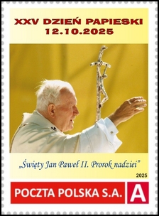 Wrzesień 2025 XXV Dzień Papieski 12.10.2025 "Święty Jan Paweł II. Prorok nadziei" Zamawiający: Zbigniew Lewkowicz Nakład: brak informacji [arkusz 3+3+3] (numery arkuszy: brak informacji) Projekt: Zbigniew Lewkowicz + GKK Uwagi: nadruk na arkuszu: XXV DZIEŃ PAPIESKI 12.10.2025 - góra, Święty Jan Paweł II - strona lewa, Karol Wojtyła - Habemus Papam - 18.10.1978 - strona prawa, Emsja prywatna - dół |